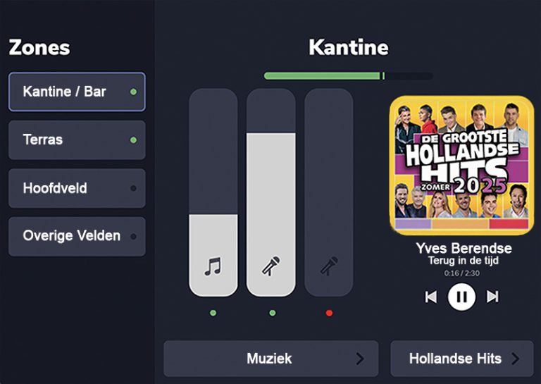 Met dit gebruiksvriendelijke touchpaneel regel je makkelijk het geluid op de velden, tribunes, terras en in de kantine. Je kunt zelfs je favoriete playlist aanzetten maar ook de microfoons. Dit kun je per ruimte afzonderlijk regelen.